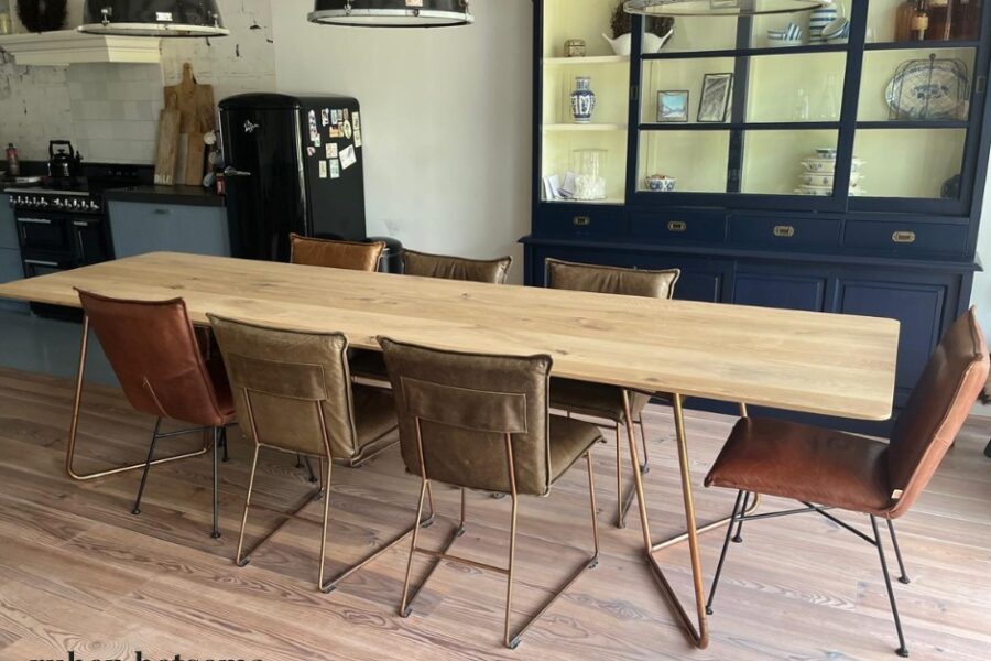 Deze eiken maatwerk eetkamertafel is een prachtige tafel met een natuurlijke look. Geef de afmetingen door en wij maken de tafel geheel naar uw wens! Kom gerust langs in de showroom voor meer informatie over Ruben zijn maatwerk! Het eikenhouten tafelblad met gestopte noesten heeft daarentegen een strakke vormgeving waarvan de kopkanten schuin naar buiten zijn afgewerkt. Charleston is een perfect afgewerkte tafel die naar eigen smaak kan worden samengesteld, met een verkoperd onderstel en kan het tafelblad ook in verschillende finish / look geleverd worden in diverse maten