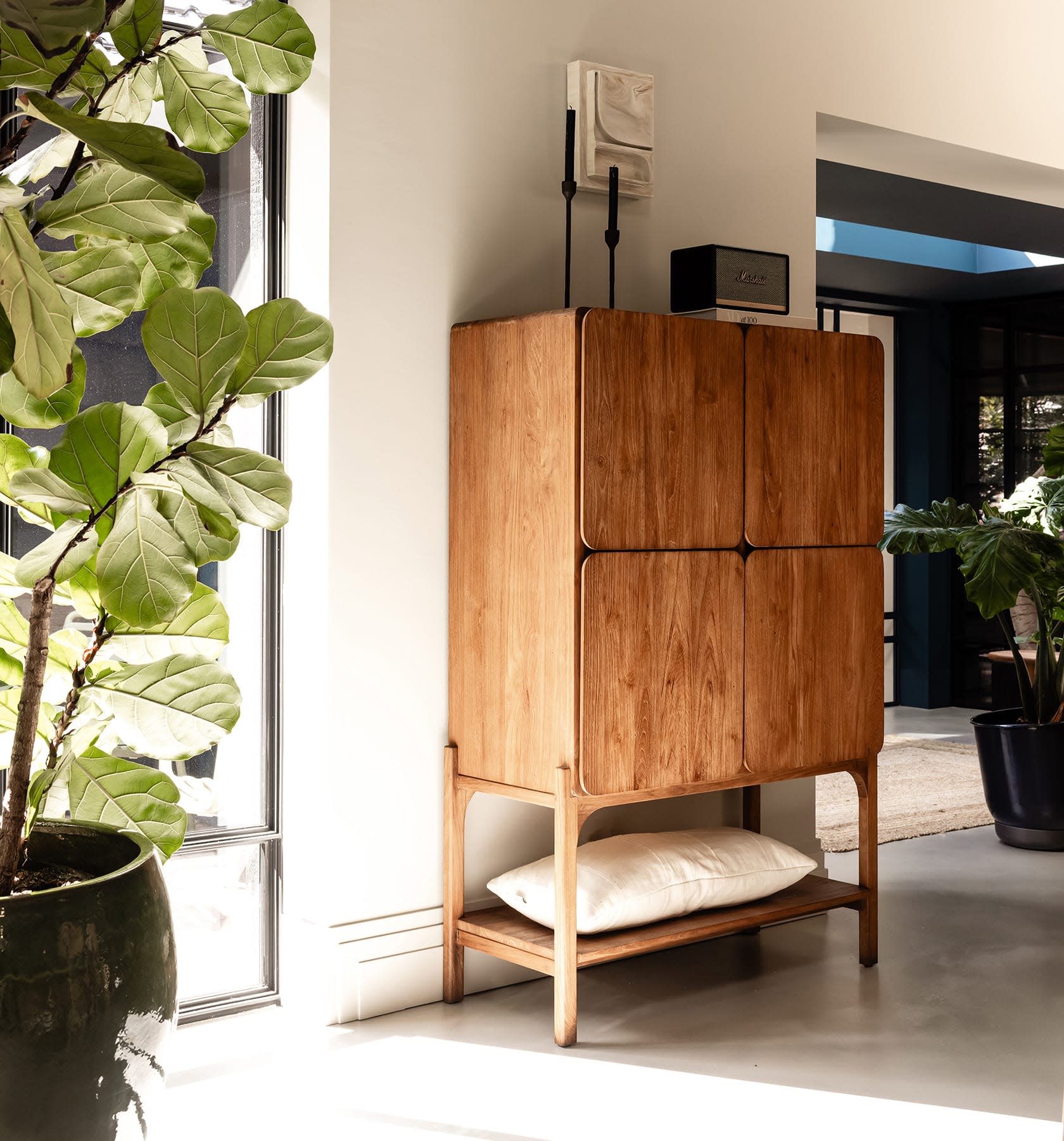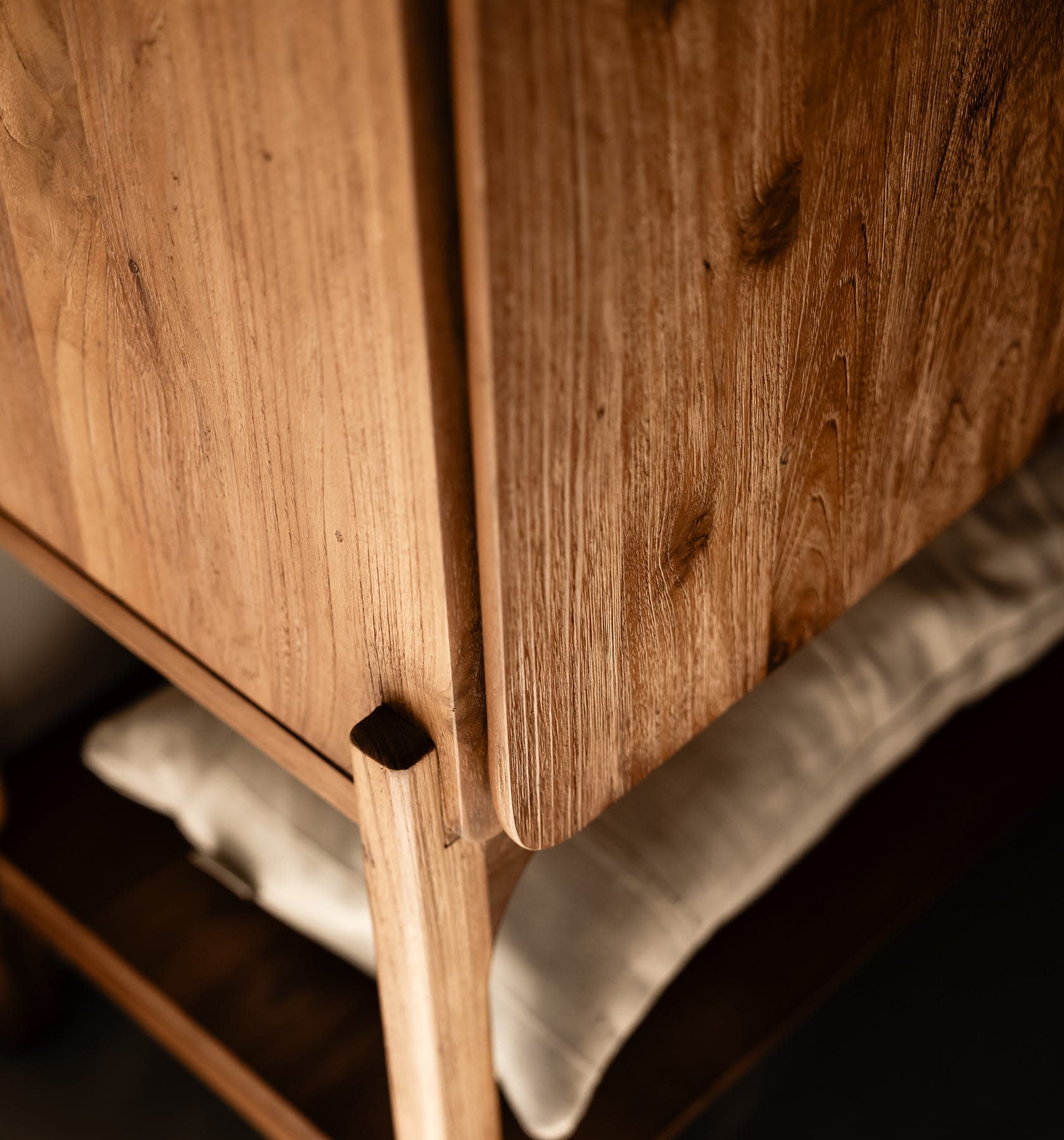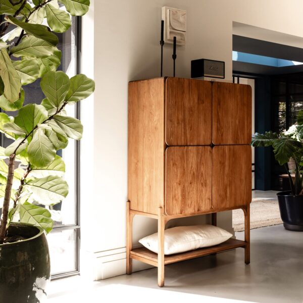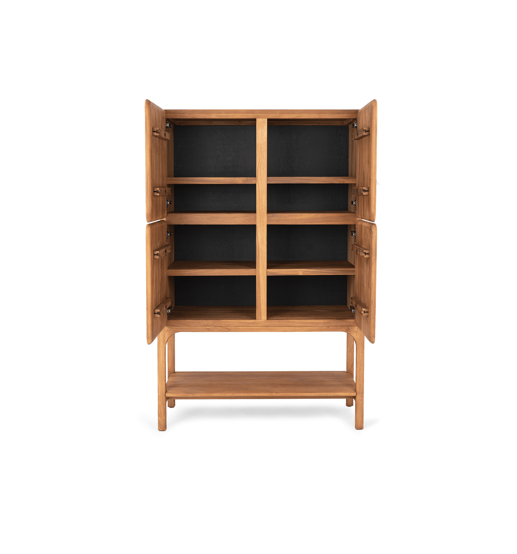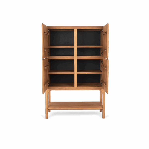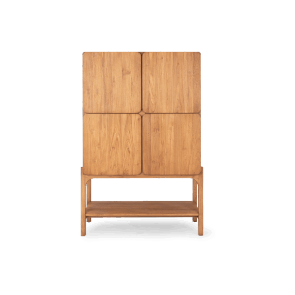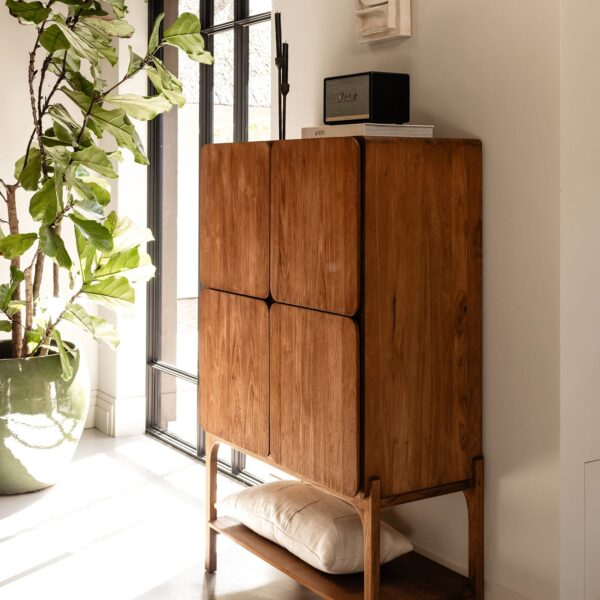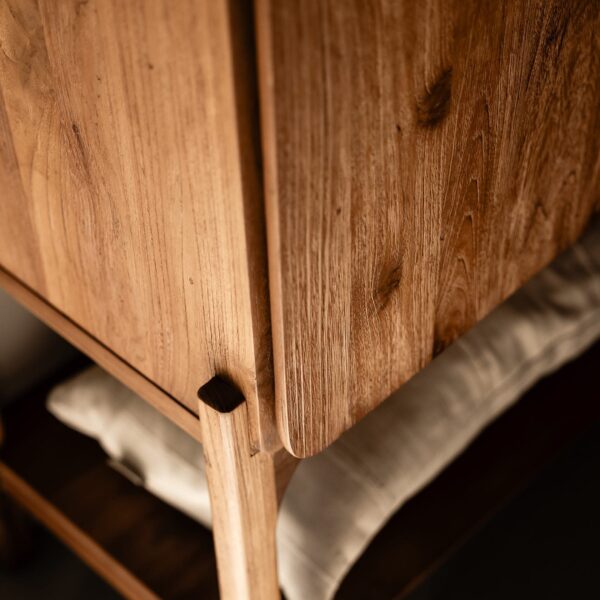 Deze unieke kast uit de Tess collectie is een duurzame eyecatcher voor elk interieur. Gemaakt van massief gerecycled teakhout, inclusief het stevige onderstel, straalt deze kast natuurlijke klasse en kwaliteit uit. De vier afgeronde deuren zorgen voor een elegante, moderne look, terwijl de open onderzijde het meubel luchtig en ruimtelijk houdt. Perfect als stijlvolle opbergoplossing in de woon- of slaapkamer. Deze teakhouten kast combineert functionaliteit met een tijdloos, artistiek vormgegeven design en past moeiteloos in diverse interieurstijlen. Kies voor duurzaamheid en stijl met deze hoogwaardige kast. Ontdek meer duurzame meubelen online en geef je interieur een natuurlijke upgrade.