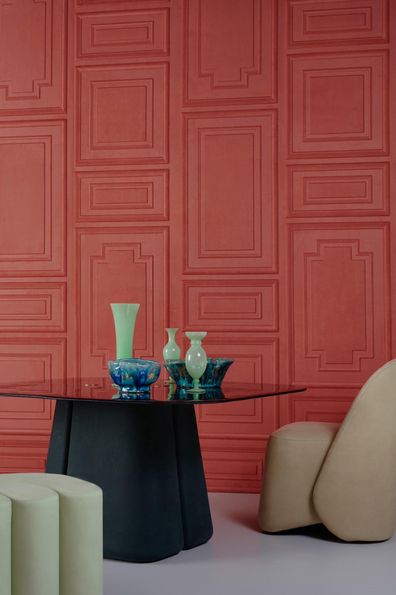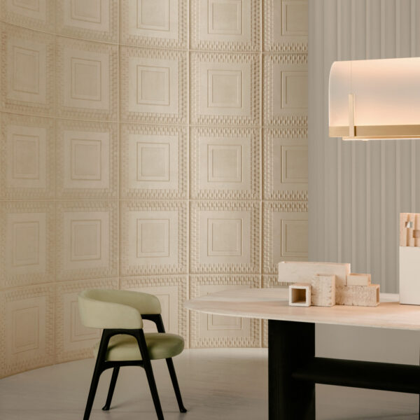 Pantheon – Dit ontwerp is geïnspireerd op het cassetteplafond van het Pantheon. De Romeinen gebruikten deze constructie om de gewelven van koepels en plafonds lichter te maken. Pantheon voegt naast kleur en textuur ook reliëf toe aan de muur. Het is afgewerkt in een look van zachte suède voor een extra aaibaar resultaat. Daarnaast heeft deze 3D-muurbekleding ook een positieve invloed op de akoestiek.